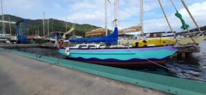Später sind wir live dabei, wie Pepinos Boot ins Wasser gehoben wird. Er ist ein echtes Unikat, hat kaum Ahnung vom Segeln, das Boot für ganz kleines Geld in Martinique gekauft und hier bunt lackiert. Hübsch ist es geworden, nur geht nach ca. 30 Metern der Motor aus und wir ziehen und schieben ihn mit mehreren Dingis in den kleinen Hafen der Werft. Ob er wohl jemals mit diesem Boot Trinidad verlassen wird, ist fraglich….