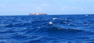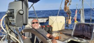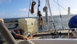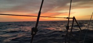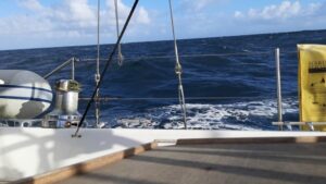 Alles was wir heute zu sehen bekommen sind ein paar fliegende Fische und ein einziges Containerschiff. Sonst ist nichts außer Wasser zu beobachten. Wir haben recht viel Wind, ca. 25 Knoten, ziemlich hohe Wellen, ca. 2 Meter, aber wir kommen gut und ziemlich schnell voran. Voraussichtlich werden wir morgen Nachmittag unser Ziel erreichen. Wir essen schon seit 2 Tagen Chili con Carne, ich habe einen großen Topf in weiser Voraussicht vorgekocht. Bei dieser Schaukelei wäre es kein Vergnügen zu kochen….ansonsten gibt es immer mal einen Apfel, Joghurt oder Erdnüsse zum Knabbern 🙂 so geht es in die zweite Nacht. Andreas hatte sich am Nachmittag 3 Stunden schlafen gelegt, so ist er diese Nacht relativ fit und ich leiste ihm in der Plicht wieder Gesellschaft.