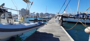 Bald kommt ein Boot mit zwei Marineros zu uns. Wir erklären, dass wir nur mit Unterstützung anlegen wollen und können. Sie wollen abklären, wo wir Platz finden  und uns dann in den Hafen begleiten. Nach 1 Stunde kommen sie zurück, wir lichten den Anker und fahren bei immernoch sehr starken Wind in die Marina Santa Marta. Am Steg stehen schon 2 Helfer und nehmen die Leinen an. Das Dingi mit den Marineros schiebt uns achtern an den Steg und wir sind festgemacht. Nach 14 Monaten sind wir das erste Mal wieder in einer Marina, an einem Steg. Was für ein Luxus, kein Dingi ins Wasser winschen, um an Land zu kommen, einfach auf den Steg hüpfen, herrlich 🙂