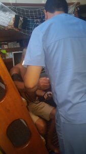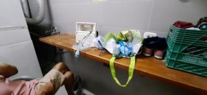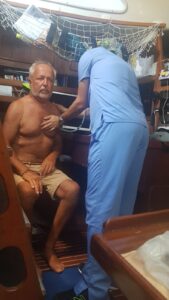 Wir frühstücken in Ruhe, dann gehen wir ins Marina-Office, um eine Mitarbeiterin dort zu bitten, für uns zu telefonieren. Wir haben eine Telefonnummer eines Arztes hier in Santa Marta von einem Freund bekommen und wir wissen, dass dieser, wie viele hier, nur sehr schlecht englisch spricht. Im Office wird unser Wunsch sofort erfüllt, die junge Angestellte ruft den Arzt an und fragt nach einem freien Termin für uns. Zu unserer Überraschung hören wir, dass der Arzt zu uns an Bord kommen wird, und dies schon in einer Stunde. Das hätten wir nun wirklich nicht erwartet und sind darüber sehr erfreut. Wir gehen duschen und zurück zum Boot, um auf ihn zu warten. Bald klopft es und der Arzt steigt samt seiner mitgebrachten Utensilien zu uns an Bord. Er kann tatsächlich nur sehr, sehr wenig englisch, aber dank eines Übersetzungsprogramms funktioniert die Kommunikation auch so sehr gut. Er untersucht Andreas gründlich, misst den Blutdruck, den Sauerstoffgehalt im Blut, hört Lunge und Herz ab und erklärt uns dann das weitere Vorgehen. Alle Werte sind ok, das beruhigt uns schonmal sehr. Er verpasst Andreas eine Spritze, dessen Inhalt wir ehrlicherweise nicht so genau kennen und überlässt uns Antibiotika, anschließend ruft er für uns in einer Apotheke an und bestellt andere Medikamente und ein Inhaliergerät. Weiter sagt er uns, dass heute noch eine Laborangestellte zu uns kommt, um Blut abzunehmen und ein Ultraschall des Oberkörpers stattfinden sollte. Den Termin dafür wird er uns per Whatsapp mitteilen. Alles läuft, wie überall, völlig unkompliziert ab. Am Montag wird er wieder zu uns kommen. Kaum ist er von Bord, klopft es wieder, die Medikamente kommen. Kurz danach ist die Labormitarbeiterin bei uns und nimmt Andreas Blut ab. Das Inhaliergerät wird uns später extra von einer Krankenschwester gebracht und Andreas wird eine Einweisung der Benutzung erhalten. Diese Krankenschwester lässt lange auf sich warten, 21.30 Uhr schreibt sie per Whatsapp, dass sie am Eingang steht. Wir holen sie ab und gehen gemeinsam zur Minna. Dort stellen wir fest, dass das Gerät mit unseren europäischen Steckdosen leider nicht kompatibel ist und wir uns einen anderen Platz fürs Inhalieren suchen müssen. Die Wahl fällt auf den Raum mit den Waschmaschinen. Dort steht ein Tisch, ein Stuhl und eine Steckdose finden wir auch. Nun wird uns die Anwendung haarklein erklärt, anschließend überlässt sie uns das Gerät und verabschiedet sich. Für all diese Bemühungen und den Service zahlen wir insgesamt ca 100 Euro, sicher wird im Laufe der nächsten Tage noch einiges dazu kommen, aber wir sind über diese günstigen Preise echt erstaunt. All dies wird die Auslandskrankenversicherung übernehmen, davon gehen wir jedenfalls aus. Ob Andreas in Deutschland eine so schnelle und umfassende Erstbehandlung bekommen hätte, ist fraglich….