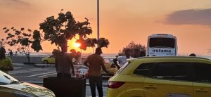 Am Flughafen können wir den Sonnenuntergang über dem Meer beobachten, der Flughafen liegt direkt daneben und wir warten lieber im Freien, als in der völlig unterkühlt klimatisierten Halle. Kurz nach 18 Uhr landet der Flieger aus Bogota, von wo die Beiden einen Anschlußflug genommen haben. Recht schnell sind die Beiden und ihre Koffer bei uns und die Freude ist bei uns Vieren groß. Zurück gehts mit dem selben Taxi, der Fahrer hat scheinbar auf uns gewartet….