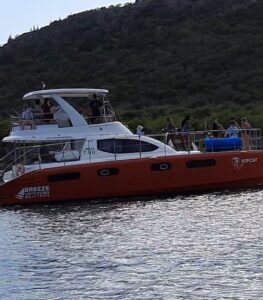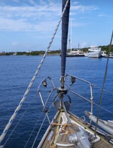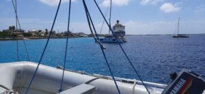 Gegen 9 Uhr löse ich die Festmacher von der Muringboje und wir verlassen Bonaire. Kurz danach rollen wir das Vorsegel auf Steuerbord aus. Das Großsegel setzen wir nicht, es reicht völlig nur mit dem Vorsegel. Wir sind mit ca. 6 Knoten unterwegs. Vor uns liegen ca. 40 sm, vorraussichtlich werden wir ca. 16 Uhr in Spanish Water, der Ankerbucht vor Curacao, ankommen. Leider sind die Wellen mal wieder ziemlich hoch, die Minna rollt von rechts nach links und wieder zurück. Man hat das Gefühl also würde man rollen, statt zu segeln….aber das Wetter ist toll, die Sonne brennt vom Himmel und wir kommen ganz gut voran….
