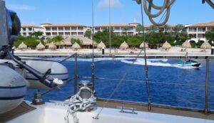 Wie geplant, kurz nach 16 Uhr, passieren wir die echt sehr enge Einfahrt nach Spanish Water im Süden der Insel. Rechts und links ist es nur ca. 3 Meter tief, Andreas manövriert uns perfekt in der Mitte des Fahrwassers durch dieses Nadelöhr. Vorbei am tollen Strand Santa Barbara gehts bis zur Marina Spanish Water. Davor ist viel Platz zum Ankern. Einige andere Segler liegen hier schon, aber es ist immer noch genug Platz für uns. Ca. 17 Uhr fällt der Anker in 5 Meter Tiefe und hält auf Anhieb. Wir sind gut in Curacao angekommen. Nun noch ein paar Anrufe und Nachrichten an die Familie und Freunde, Abendessen und ausgiebig duschen…..