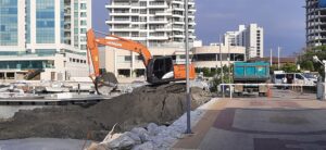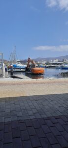 Ein Bagger im Hafenbecken, er räumt Schlamm beiseite
