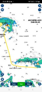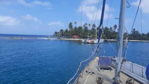 Gegen Mittag lichten wir den Anker und verlassen die Insel. Unser eigentliches Ziel ist Isla Hollandes, als wir aber aus der Ankerbucht raus sind, merken wir schnell, dass die Strecke unangenehm werden wird. Es gibt ziemlich viel Wind aus der falschen Richtung und auch viel Welle. Auf halber Strecke beschließen wir deshalb nach Coco Bandero abzubiegen. Die Einfahrt ist spannend, links und rechts Riffe…