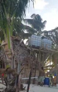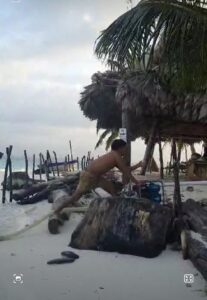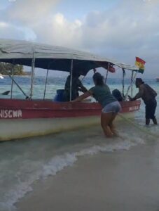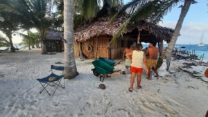 Bevor die Sonne untergeht, fahren wir nochmal zum Strand, die Insel ist bewohnt, wir werden sehr freundlich empfangen. Gerade ist ein Boot mit zwei großen Fässern Wasser angekommen, wir machen uns nützlich und helfen beim Abpumpen….